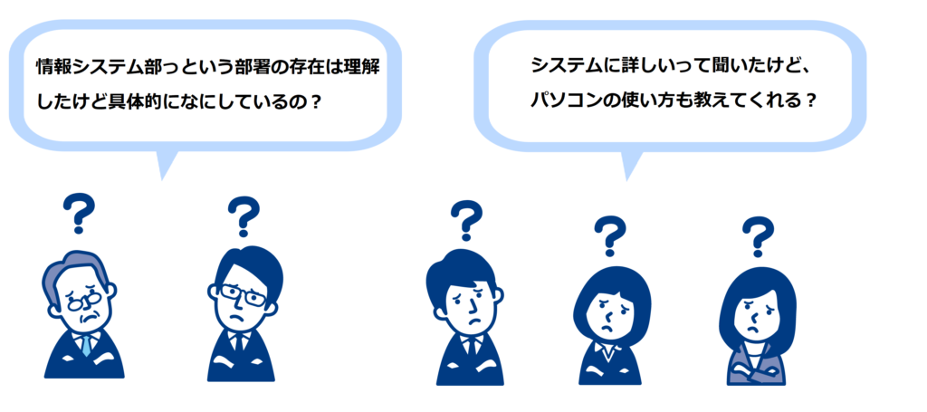 そこで、仮にあなたの会社に情報システム部の部署や機能があった場合、ちゃんと活用できてますか?おそらく多くの方が「いいえ」と答えるでしょう。それは、どんな存在なのかわからないので何をお願いできるかわからないからです。