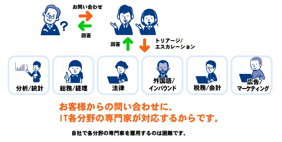 また、問い合わせの内容に応じて専門家の対応が必要と判断されたケースにつきましては、弊社スタッフが窓口として専門家とのやりとりを行い、貴社へわかりやすい内容にまとめた状態でご報告いたします。