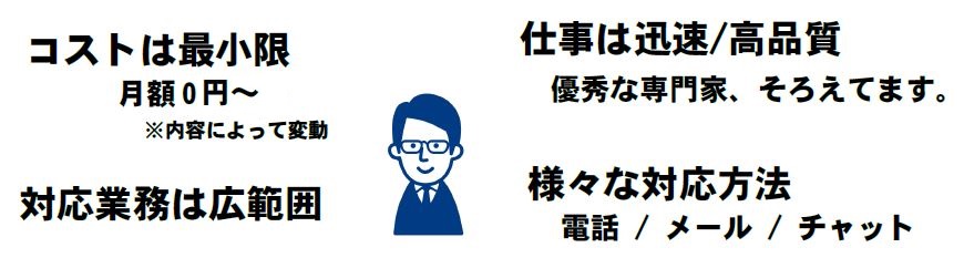 知識と経験豊富で優秀なスタッフが迅速かつ的確に貴社のお悩みにお答えします。また、上記でもお話ししましたが、対応業務の範囲は同業内随一の広範囲でカバーし、料金形態も無料でのお試しプランからじっくり対応を希望される企業向けの充実したプランまでご用意しております。